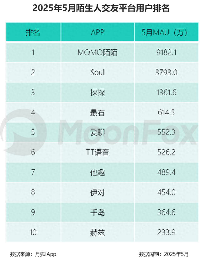 根据极光月狐最新数据,陌陌和soul占据市场前二,其中陌陌领先差距明显。